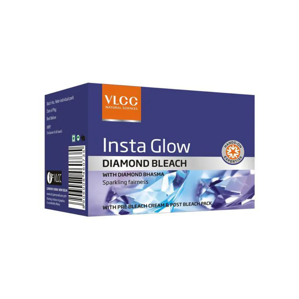 VLCC Insta Glow Diamond Bleach is a popular facial hair bleaching system designed to provide an instant “sparkling white shine” and a radiant, purified complexion. It is formulated with colloidal diamond (also referred to as Diamond Bhasma, which is diamond ash obtained through traditional Ayurvedic processes), and Aloe Vera, ingredients highly valued for their skin-benefiting properties. This bleach is part of a multi-step regimen (typically 3 steps) and aims to not only lighten unwanted facial hair to seamlessly blend with your skin tone but also to enhance overall skin fairness, purify, hydrate, and rejuvenate the skin.